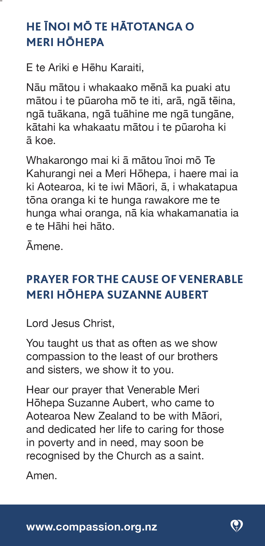 You taught us that as often as we show compassion to the least of our brothers and sisters, we show it to you. Hear our prayer that Venerable Meri Hōhepa Suzanne Aubert, who came to Aotearoa New Zealand to be with Māori, and dedicated her life to caring for those in poverty and in need, may soon be recognised by the Church as a saint. Amen.